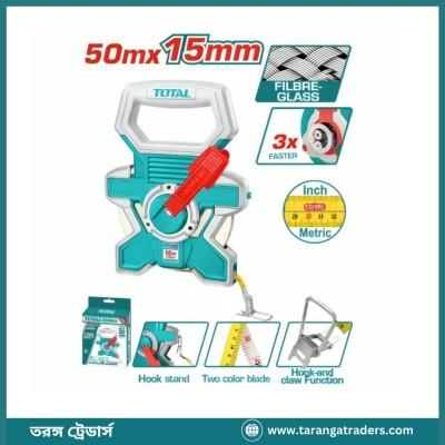 Equipped with a sturdy frame and ergonomic handle, it offers smooth winding and comfortable operation during prolonged tasks. Whether you are a professional surveyor or working on large construction projects, this TOTAL measuring tape ensures reliable and consistent performance.